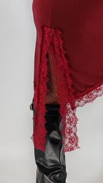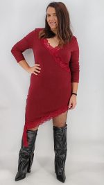 Φόρεμα πλεκτό λεπτό με βισκόζι με λεπτομέρειες δαντέλας στο V και στο τελείωμα. Είναι ασύμμετρο με σκίσιμο, One size και καλύπτει από ΧS έως ΧL