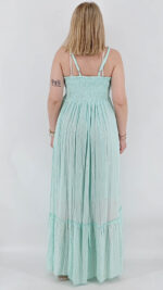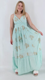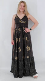 Φόρεμα boho από βαμβακερή γάζα με λεπτομέρειες λούρεξ και κεντήματα. Είναι κρουαζέ στο στήθος, έχει ρυθμιζόμενη ράντα, σφιγγοφωλιά στην πλάτη και άνετο λάστιχο κάτω από το στήθος. One size, καλύπτει από S έως XL