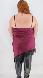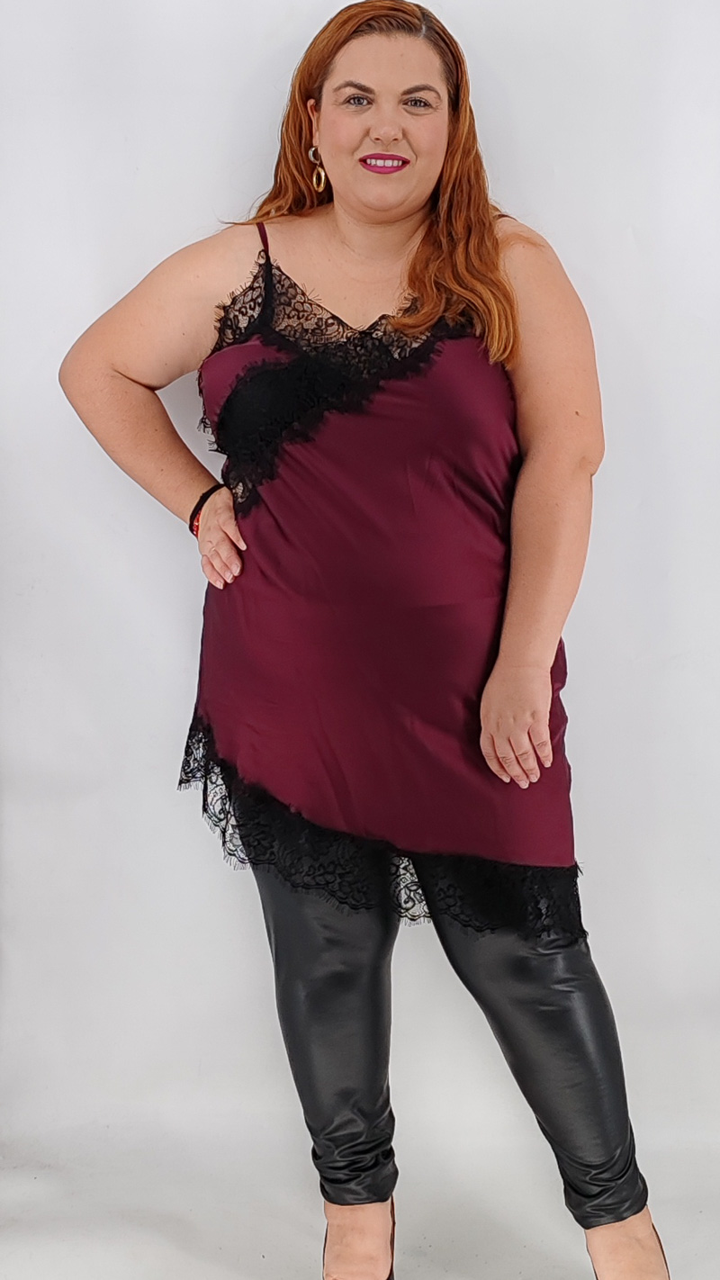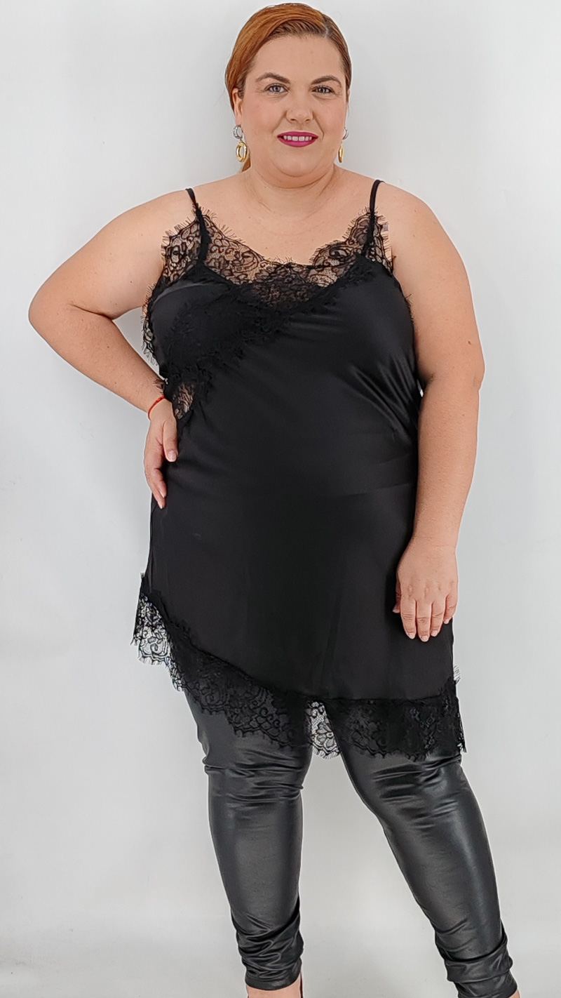 Φόρεμα σατέν τύπου λινζερί, ασύμμετρο, με λεπτομέρειες από δαντέλα. One size Καλύπτει από L έως 3ΧL