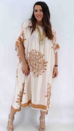 Φόρεμα τύπου καφτάνι από σατέν βαρύ ύφασμα που δεν διαφανίζει με επένδυση βισκόζι. Ιδανικό και για καλή περίσταση. One size, καλύπτει από S έως 4XL