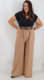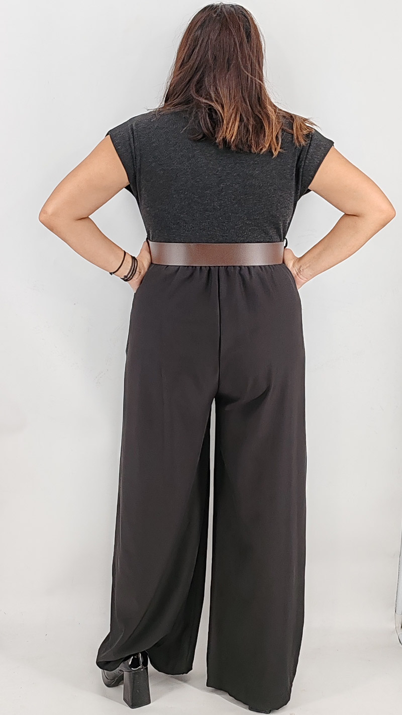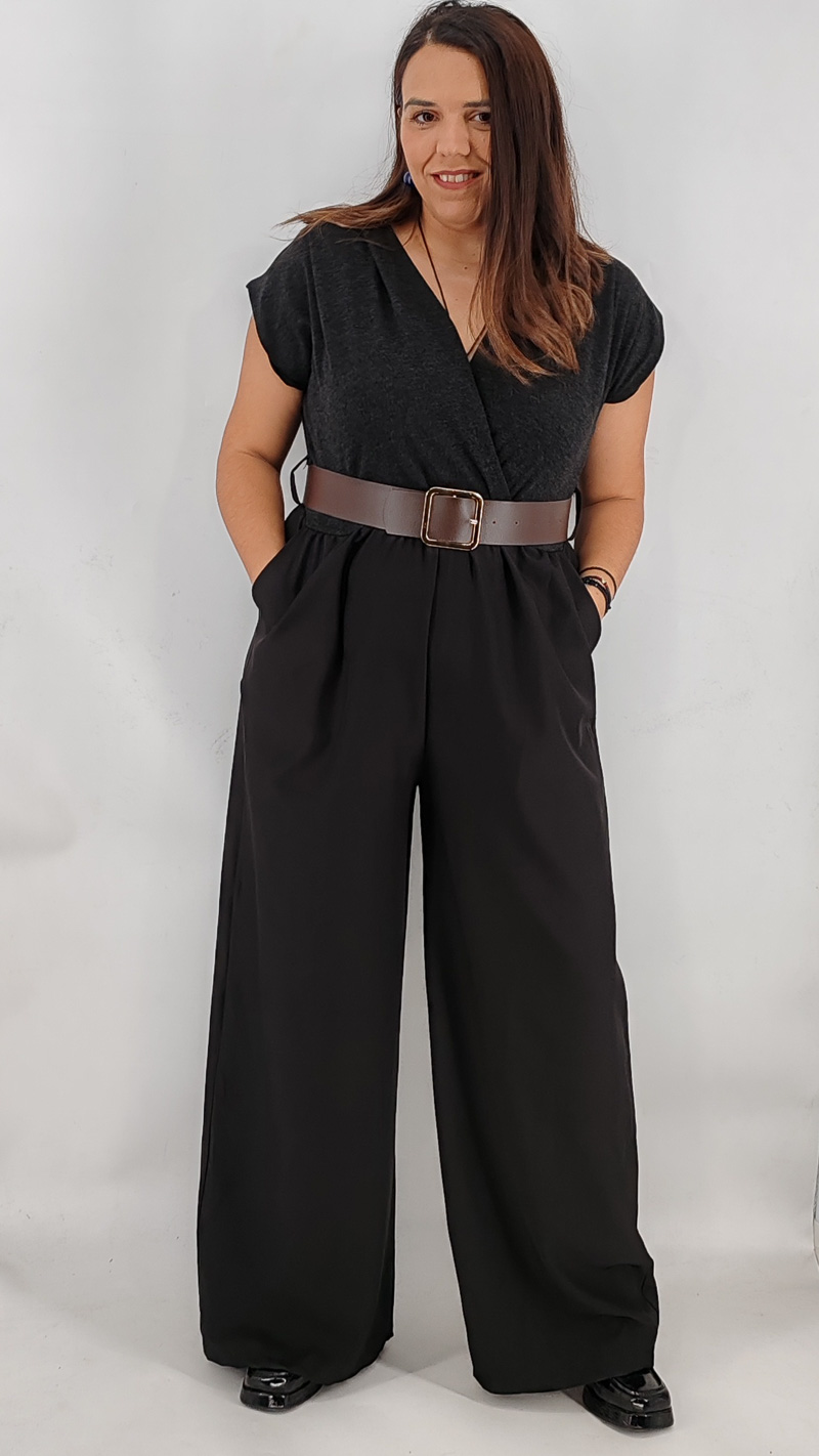 Ολόσωμη φόρμα με κρουαζέ το πάνω μέρος από πλεκτό ελαστικό ύφασμα, λάστιχο στη μέση και παντελόνα με τσέπες από ύφασμα κοστουμιού, διαθέτει δική του ζώνη. One size, καλύπτει από S έως ΧL