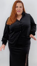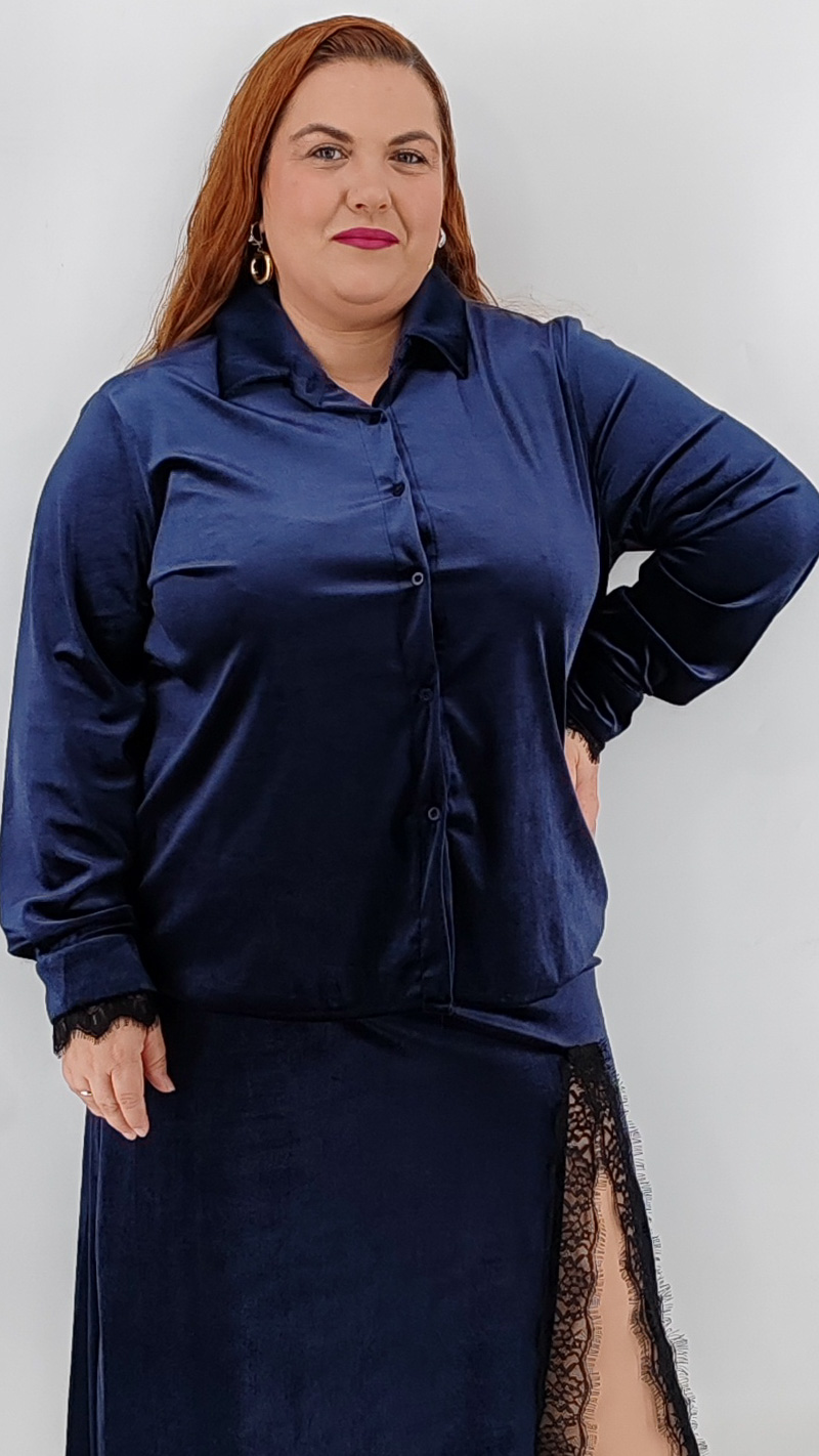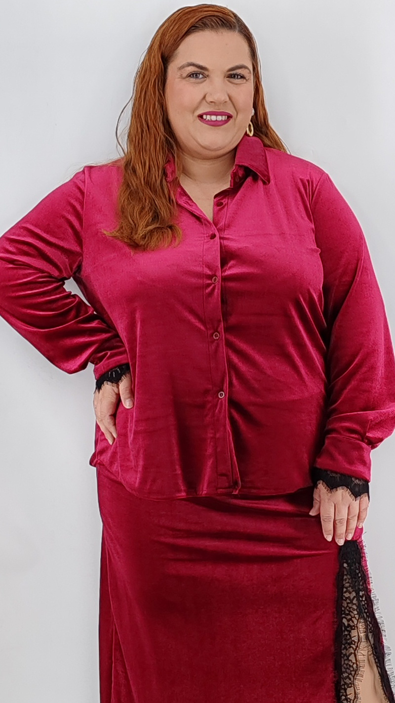 Πουκάμισο σε άνετη oversize γραμμή από βελούδινο ύφασμα, με λεπτομέρειες από δαντέλα στο μανίκι, μπορεί να συνδυαστεί με την βελούδινη φούστα. One size καλύπτει από M έως 3XL