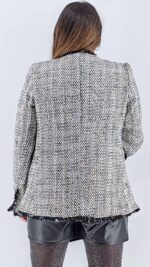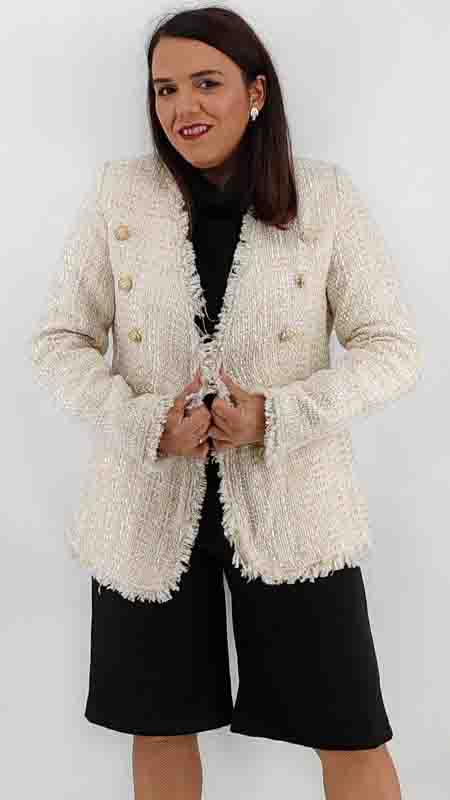 Σακάκι μάλλινο τουίντ με λούρεξ και χρυσά κουμπιά. Διαθέτει φόδρα και είναι σε εφαρμοστή μεσάτη γραμμή.