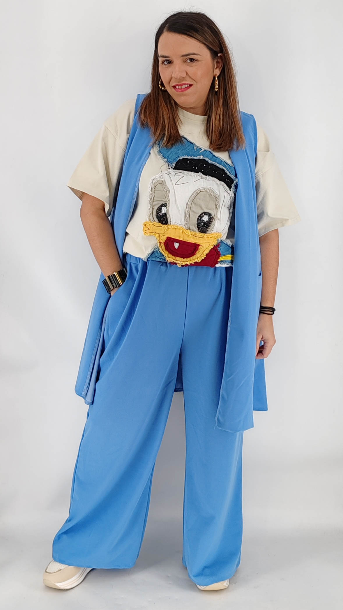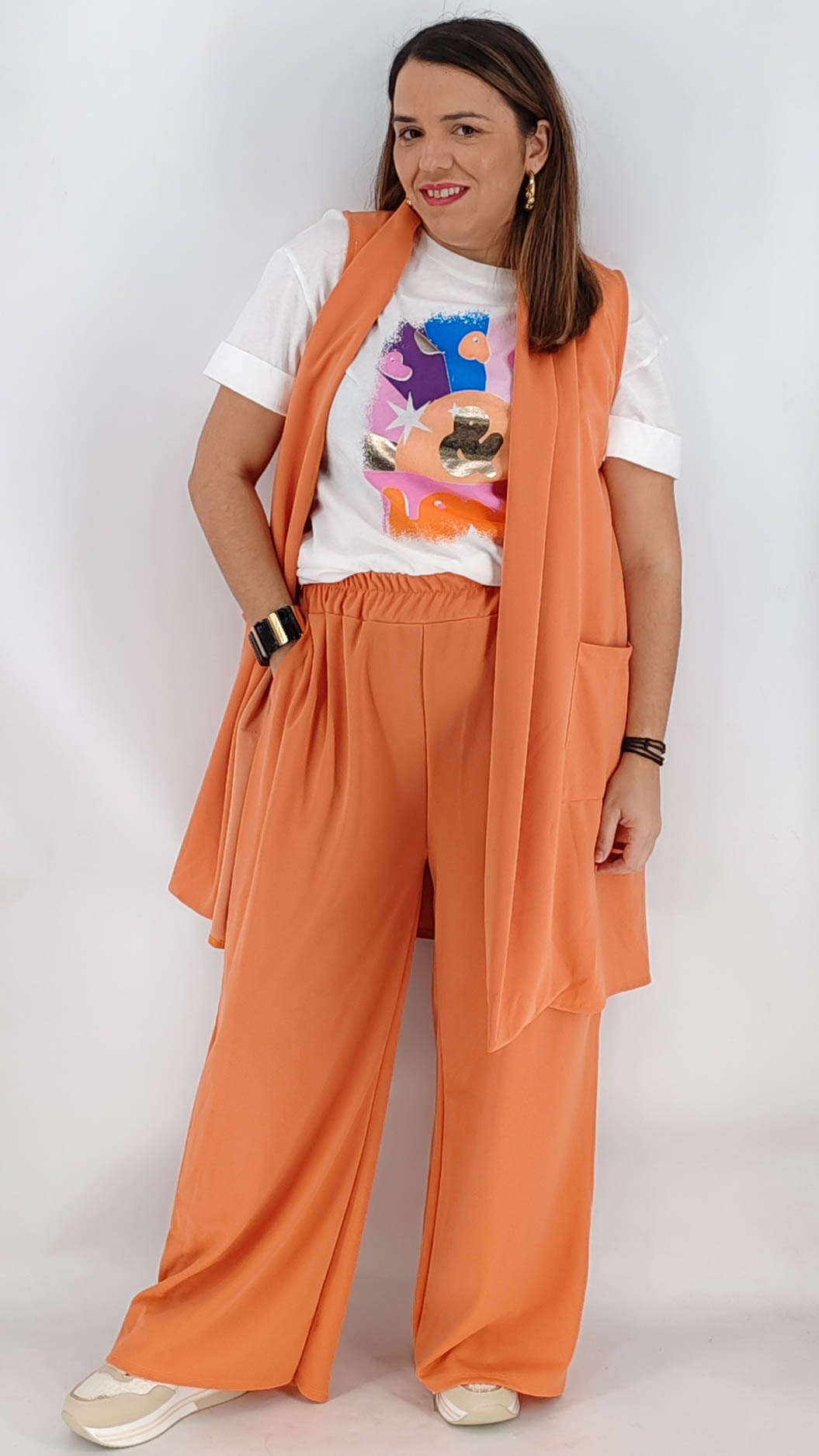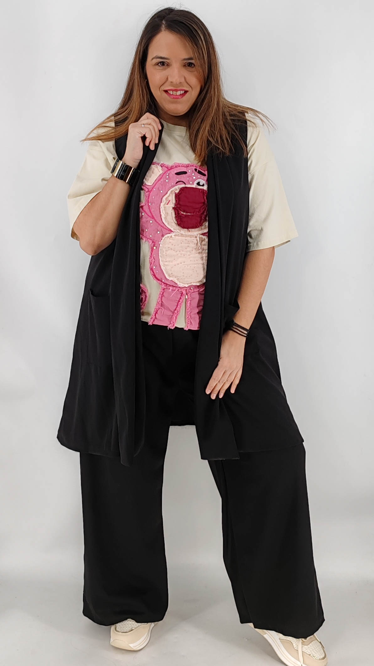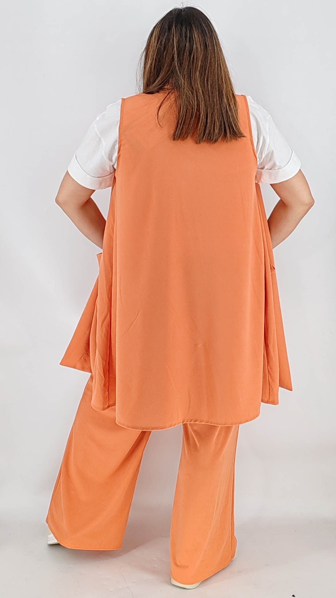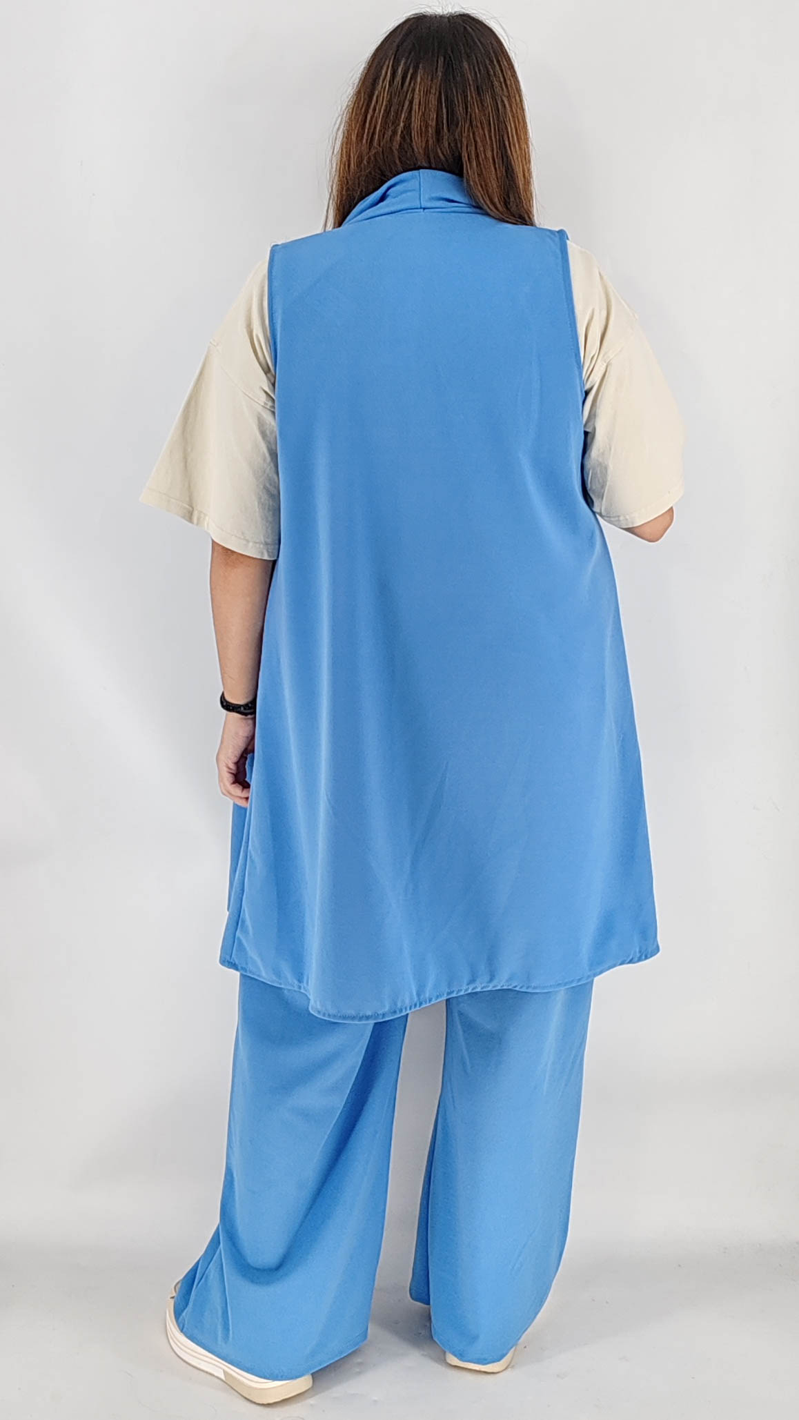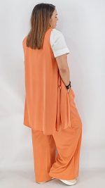 Σετ σε plus size γραμμή με αμάνικο μακρύ σακάκι με τσέπες και παντελόνα σε άνετη γραμμή. One size καλύπτει από L έως 4ΧL.