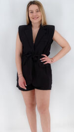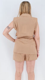 Σετ από βαμβακερό λινό. Aμάνικο σακάκι με δική του ζώνη και βάτες, μαζί με σορτσάκι με πιέτες, τσέπες και λάστιχο στο πίσω μέρος. Ιδανικά καλύπτει XS-S-M