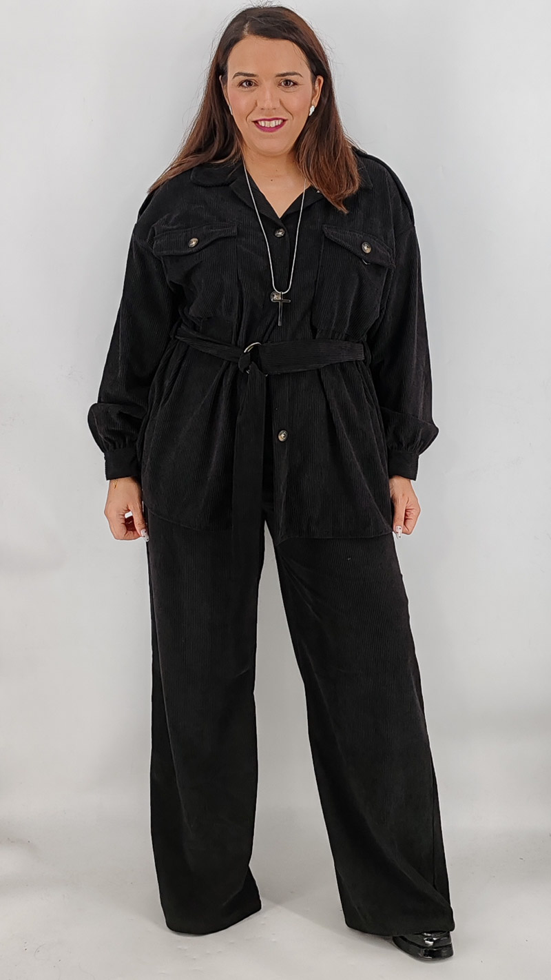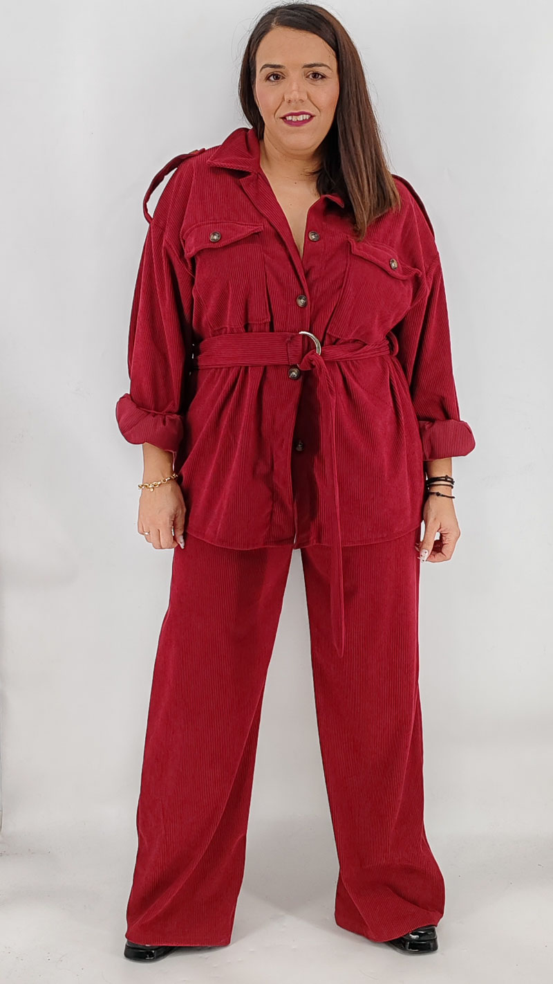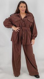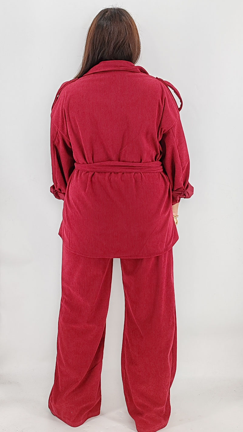 Σετ δύο τεμαχίων από κοτλέ ύφασμα. Αποτελείται από πουκάμισο με κουμπιά και δική του ζώνη, και παντελόνι με λάστιχο. One size καλύπτει από S έως XL.