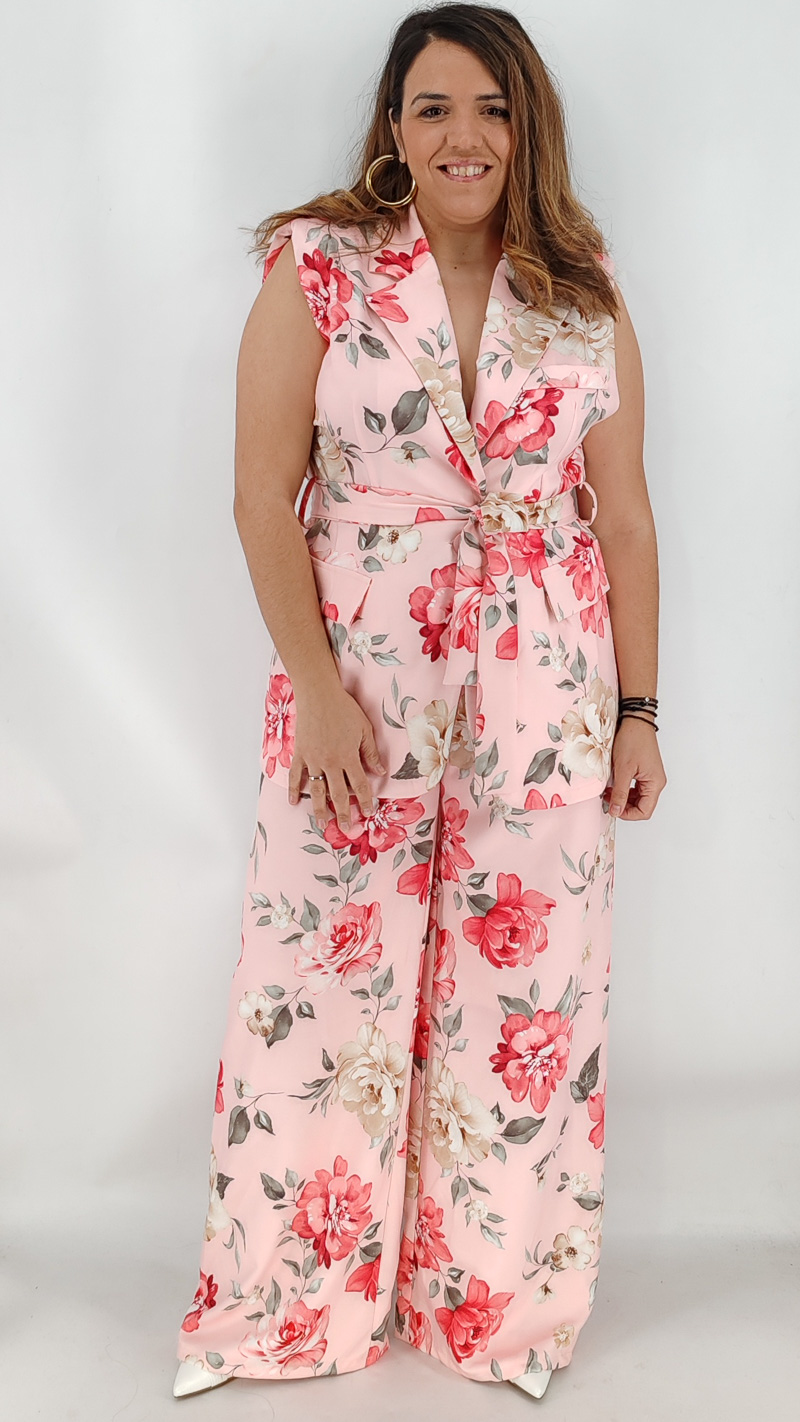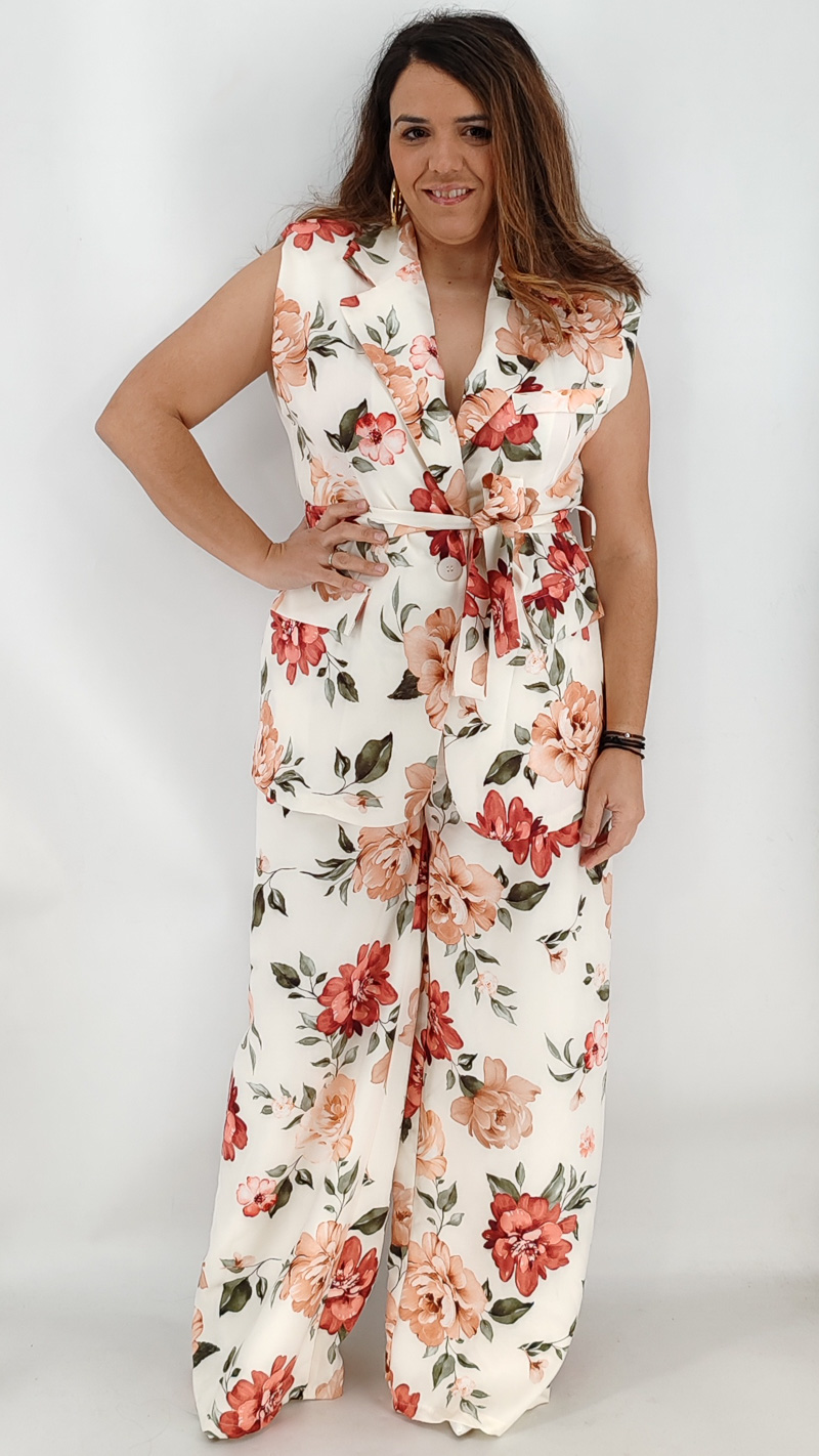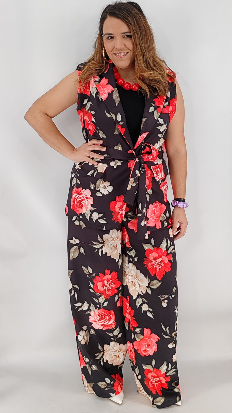 Σετ με αμάνικο σακάκι και βάτες και παντελόνα ψηλόμεση με λάστιχο και τσέπες. Κλείνει με κουμπί και διαθέτει δική του ζώνη. One size καλύπτει από S έως ΧL.