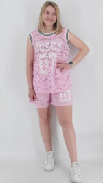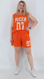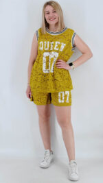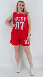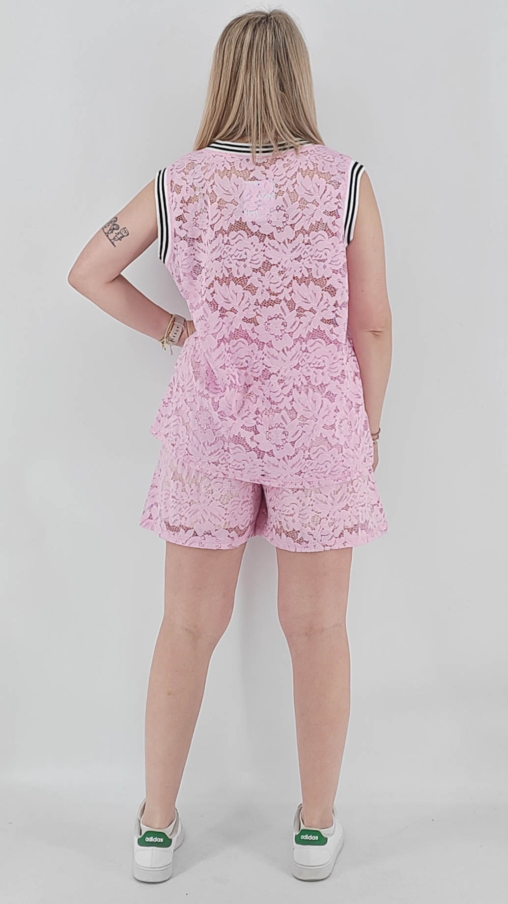 Σετ από δαντέλα με αθλητικές λεπτομέρειες. Μπλούζα αμάνικη με ώμο και σορτς μεσαίου μήκους με επένδυση. Οne size καλύπτει S μέχρι 2XL