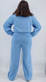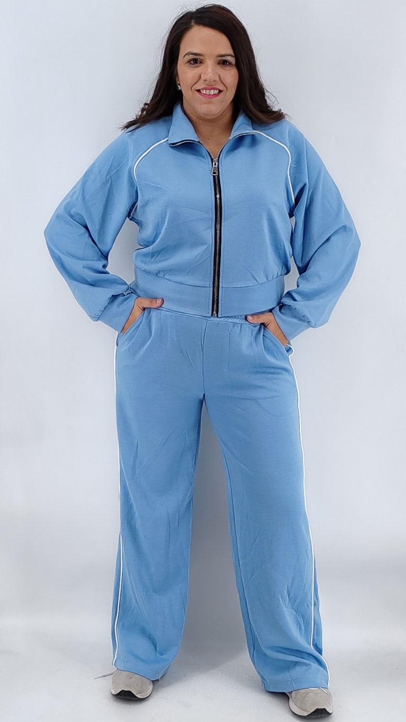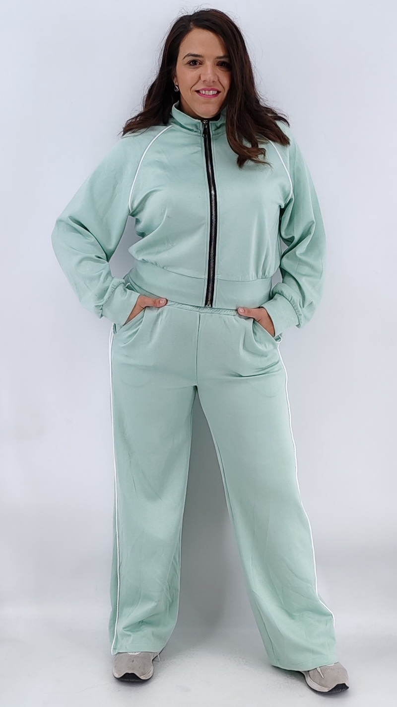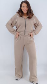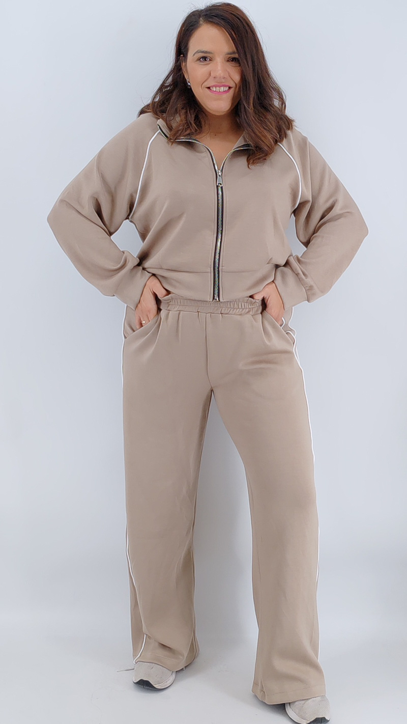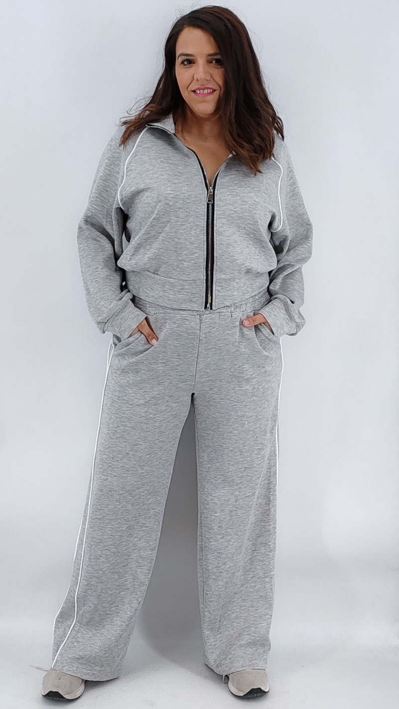 Σετ δύο τεμαχίων από βούτυρο φούτερ, με ζακέτα με φερμουάρ, μεσαίου μήκους σε άνετη γραμμή και ψηλόμεση παντελόνα με λάστιχο και τσέπες και ρίγα στο πλάι. One size Καλύπτει από S έως 2ΧL