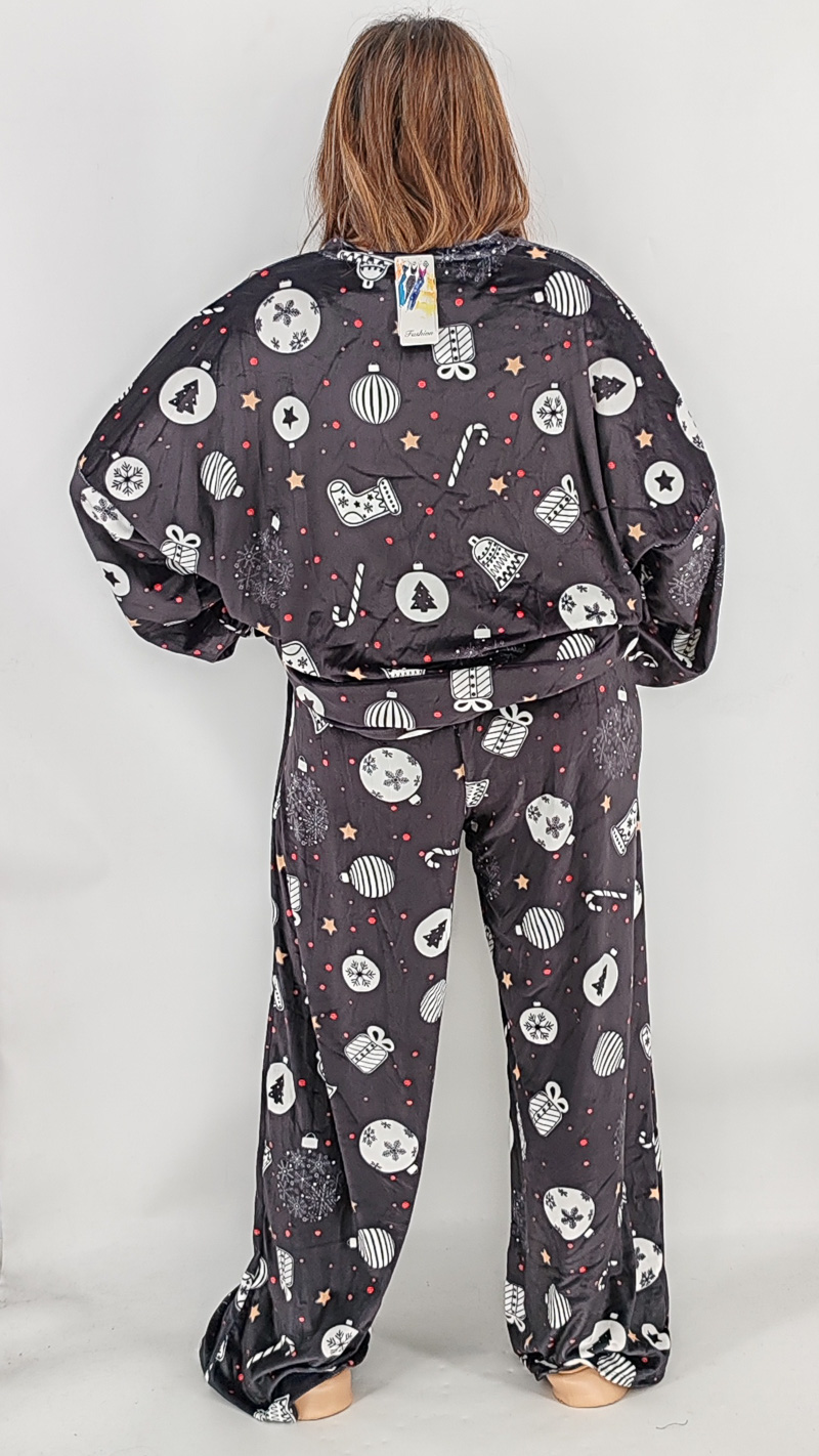 Σετ πιτζάμα σε βέλβετ ύφασμα με όμορφα σχέδια σε πολύ άνετη γραμμή που καλύπτει όλα τα νούμερα. Το ύφασμά της είναι απαλό ελαστικό και πολύ ζεστό. One size.