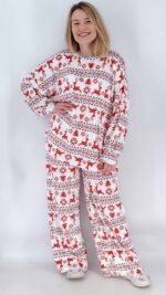 Βελούδινο σετ πυτζάμα με όμορφα σχέδια σε πολύ άνετη γραμμή που καλύπτει όλα τα νούμερα. Το ύφασμά της είναι ελαστικό, λεπτό βελούδο και πολύ απαλό. Το παντελόνι διαθέτει τσέπες. One size.
